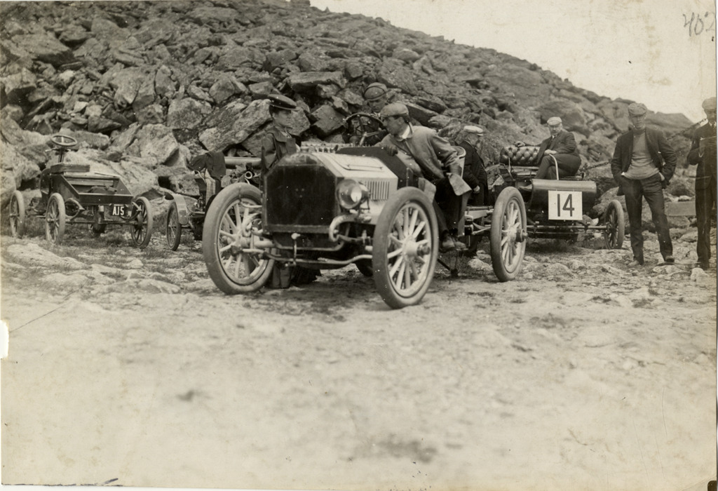 View of H.E. Rogers and passenger posing in Peerless car near the top of Mount Washington during the Climb to the Clouds Hill Climb, 1904 White Mountains tour. Car no. 14 and rocky hillside in background. The events included an endurance run in the White Mountains and the Climb to the Clouds Hill Climb on Mount Washington. Handwritten on back: "Hill climbs, Climb to the Clouds, 1904. Bretton Woods, N.H. Car #18 Peerless, 24 h.p., driven by H.E. Rogers. H.E. Rogers near top. Part of the White Mountains tour, 1904."