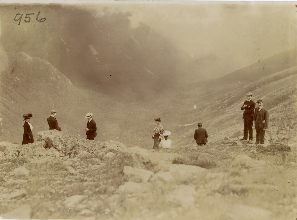 View of men and women on mountainside during the 1904 White Mountains tour. The events included an endurance run in the White Mountains and the Climb to the Clouds Hill Climb on Mount Washington. Handwritten on back: "Hill climbs, Climb to the Clouds, 1904. Bretton Woods, N.H. People, no i.d. Tours--White Mountains tour, 1904."