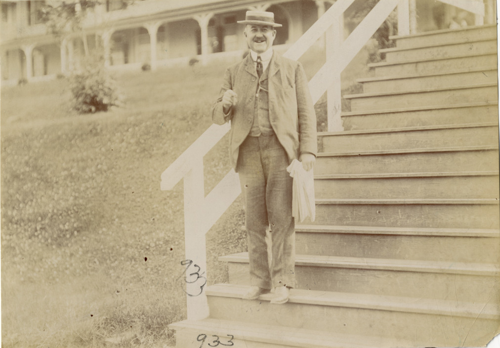 View of man posing on building steps during the Climb to the Clouds Hill Climb, 1904 White Mountains tour. The events included an endurance run in the White Mountains and the Climb to the Clouds Hill Climb on Mount Washington. Handwritten on back: "Hill climbs, Climb to the Clouds, 1904. People, no i.d. Tours--White Mountains tour, 1904."