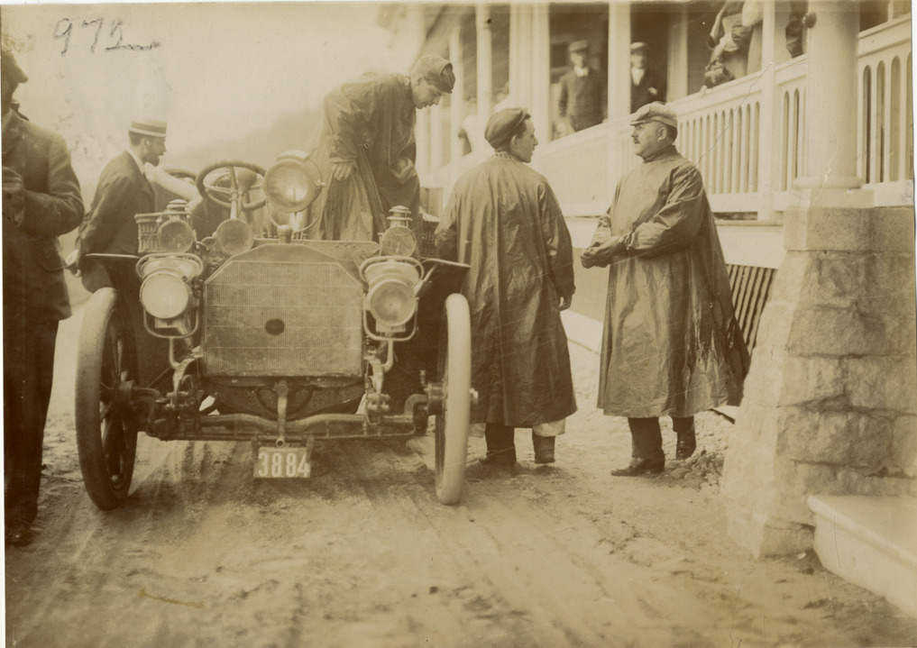 View of motorists with Mercedes car at Bretton Woods, New Hampshire during the Climb to the Clouds Hill Climb, 1904 White Mountains tour. The events included an endurance run in the White Mountains and the Climb to the Clouds Hill Climb on Mount Washington. Handwritten on back: "Hill climbs, Climb to the Clouds, 1904. Bretton Woods, N.H. Car #26, Mercedes, 40 h.p., driven by J.L. Breese. Part of the White Mountains tour, 1904."