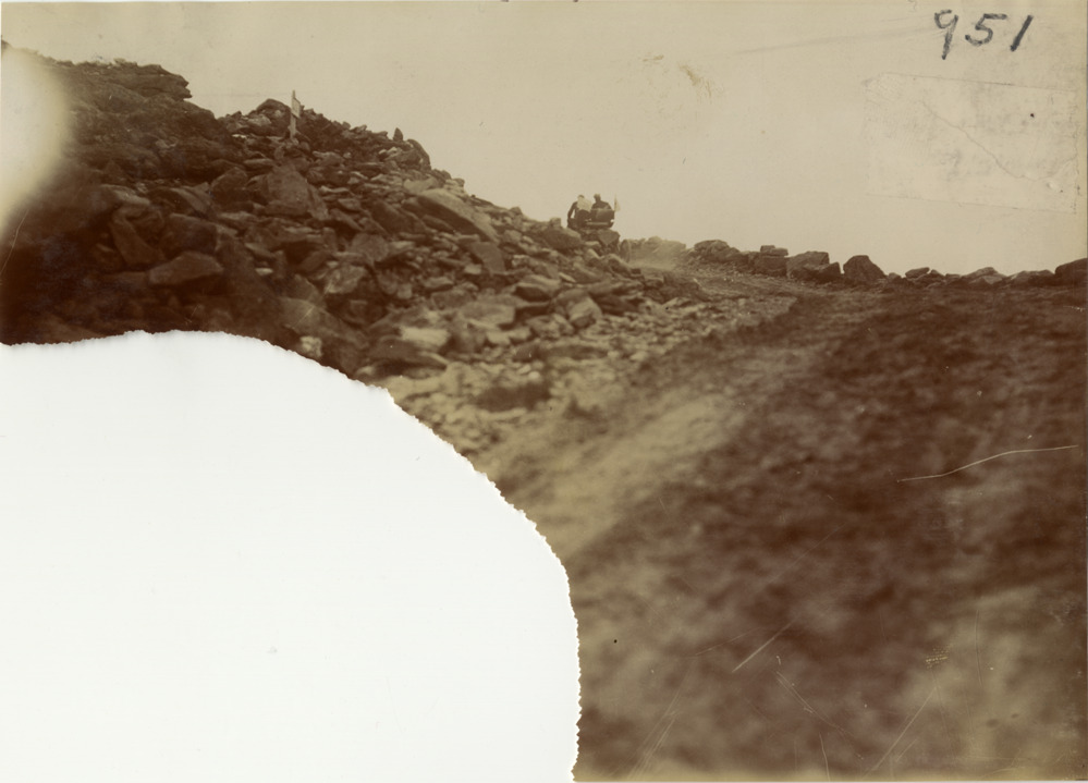 Rear view of motorists in car traveling on mountain road at Bretton Woods, New Hampshire during the Climb to the Clouds Hill Climb, 1904 White Mountains tour. The events included an endurance run in the White Mountains and the Climb to the Clouds Hill Climb on Mount Washington. Handwritten on back: "Hill climbs, Climb to the Clouds, 1904. Bretton Woods, N.H. Part of White Mountains tour, 1904."