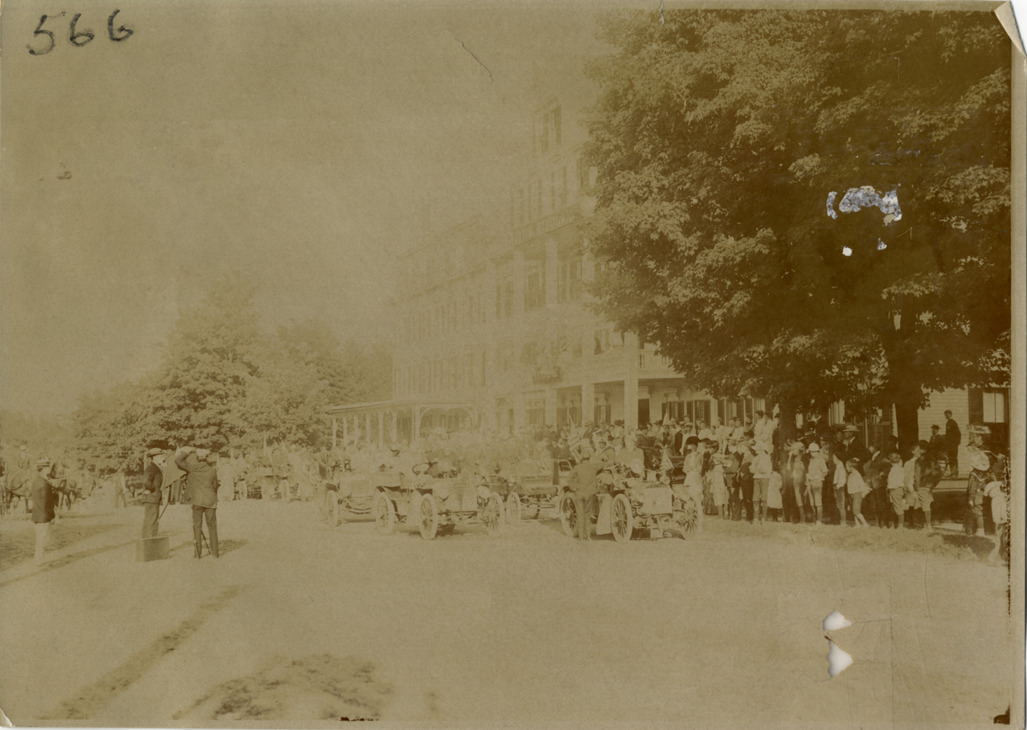 View of cars and spectators in front of hotel during the 1904 White Mountains tour. The events included an endurance run in the White Mountains and the Climb to the Clouds Hill Climb on Mount Washington. Handwritten on back: "Tours--White Mountains tour, 1904."