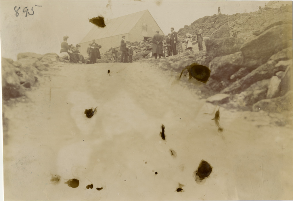 Distant view of spectators on Mount Washington during the 1904 White Mountains tour. The events included an endurance run in the White Mountains and the Climb to the Clouds Hill Climb on Mount Washington. Handwritten on back: "On Mt. Washington. Tours--White Mountains tour, 1904."