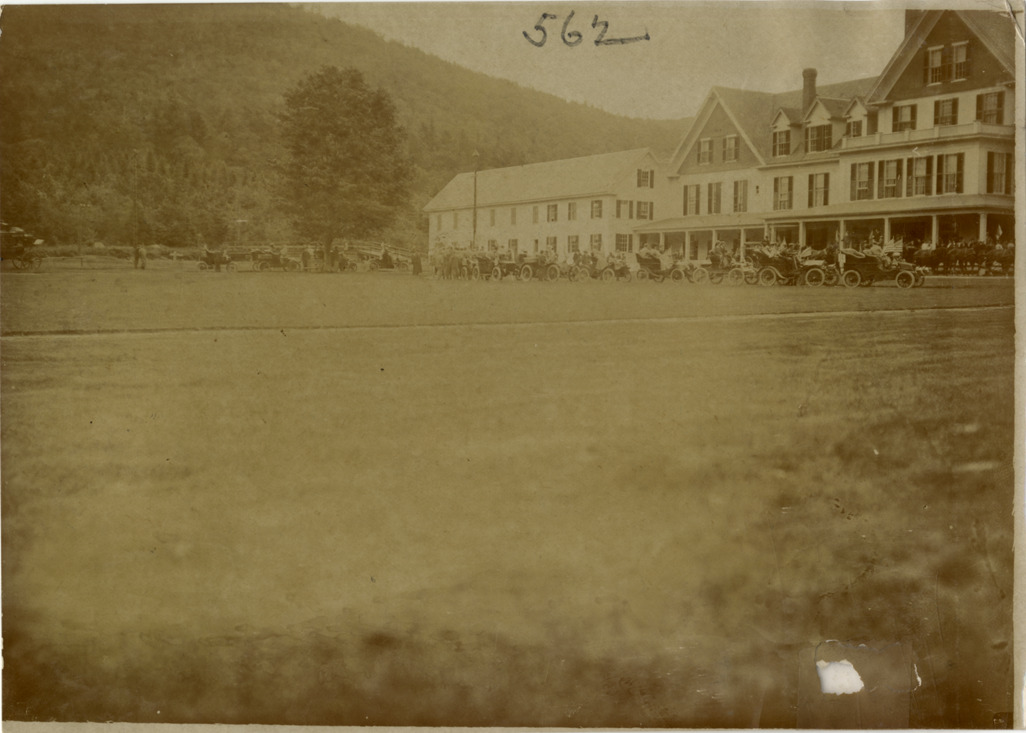 Distant view of cars lined up in front of hotel during the 1904 White Mountains tour. The events included an endurance run in the White Mountains and the Climb to the Clouds Hill Climb on Mount Washington. Handwritten on back: "Tours--White Mountains tour, 1904."