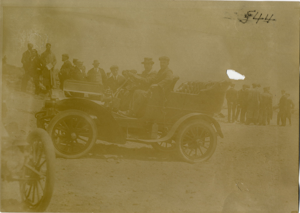 View of motorists posing in car during the 1904 White Mountains tour. The events included an endurance run in the White Mountains and the Climb to the Clouds Hill Climb on Mount Washington. Handwritten on back: "Tours--White Mountains tour, 1904."