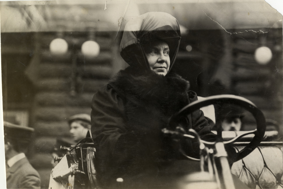 Mrs. P. Bach posing in automobile, 1909 Women's Motoring Club New York to Philadelphia Run