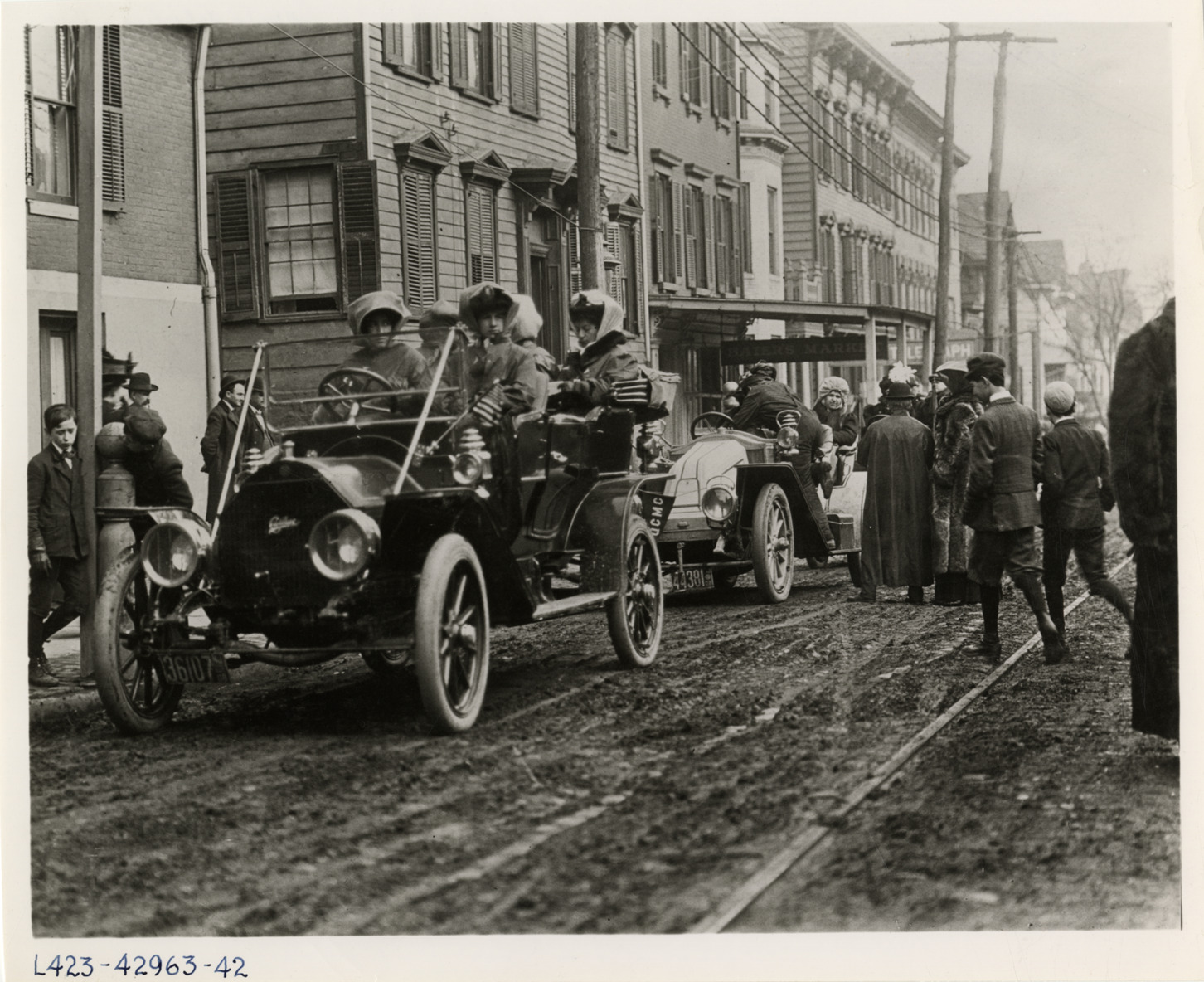 View of motorists in Cadillac car and Renault car during the 1909 New York to Philadelphia Run sponsored by the Women's Motoring Club. Wooden-frame commercial buildings in background. Handwritten on back: "Tours--Women's New York to Philadelphia Run, 1909."