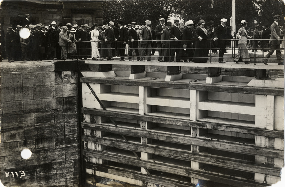 View of men and women walking over channel locks at Soo Locks during 1913 summer meeting of the S.A.E. Stamped on back: "Spooner & Wells, Inc., photographers, 1231 Woodward Ave., Detroit, Mich., telephone North 1745." Handwritten on back: "On the locks at the Soo, S.A.E. trip, 1913. Events--Society of Automotive Engineers trip."