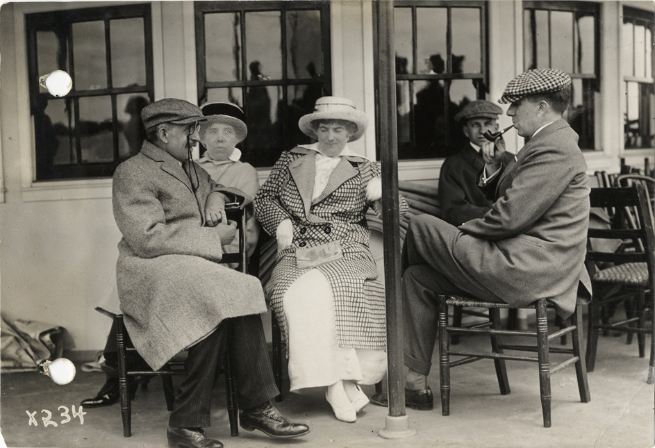 Close-up view of Colonel and Mrs. W.C. Brown and other passengers on deck of steamship City of Detroit III during 1913 summer meeting of the S.A.E. Stamped on back: "Spooner & Wells, Inc., photographers, 1231 Woodward Ave., Detroit, Mich., telephone North 1745." Handwritten on back: "Col. and Mrs. Brown, S.A.E. trip, 1913. Events--Society of Automotive Engineers trip."