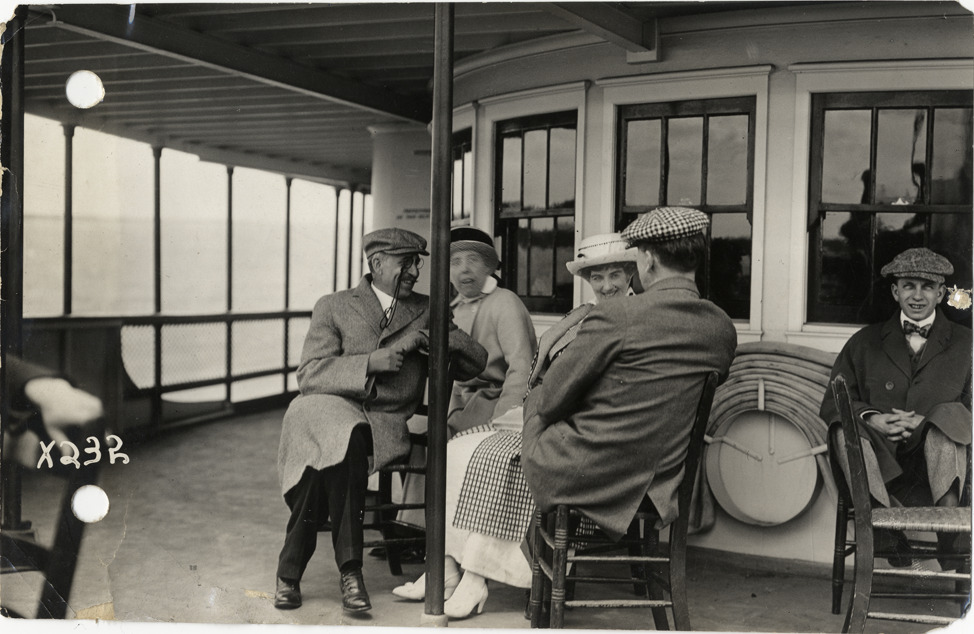 Close-up view of Colonel and Mrs. W.C. Brown and other passengers on deck of steamship City of Detroit III during 1913 summer meeting of the S.A.E. Stamped on back: "Spooner & Wells, Inc., photographers, 1231 Woodward Ave., Detroit, Mich., telephone North 1745." Handwritten on back: "Col. and Mrs. Brown, S.A.E. trip, 1913. Events--Society of Automotive Engineers trip."
