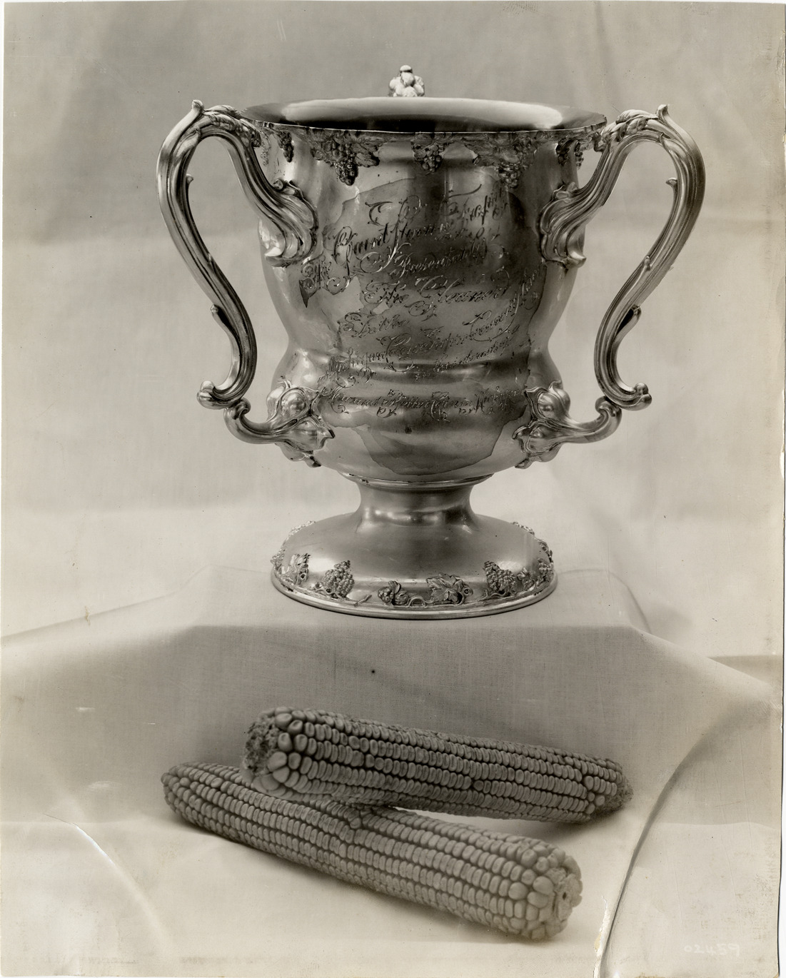 Favorite this☆ Trophy cup Description: View of trophy cup with inscription. Two ears of corn are displayed in foreground. Stamped on back: "Spooner & Wells, Inc., photographers, 1231 Woodward Ave., Detroit, Mich., telephone North 1745." Handwritten on back: "Trophies, 1911." Details Resource ID: na031364 Creator: Spooner & Wells Subject: Awards Corn Photographers--Michigan--Detroit Photographic prints Date Issued: 1911 Format: 1 photographic print ; 9.25 x 7.25 in. Member of: National Automotive History Collection Lazarnick Collection Filing Location: Trophies Rights: Physical rights are retained by DPL. Copyright is retained in accordance with U.S. copyright laws.