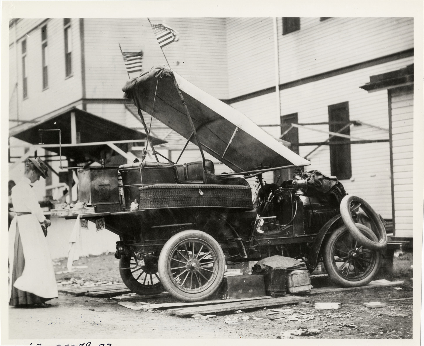 View of woman standing behind a car that has been converted into a refreshment stand during the 1907 24-hour Morris Park races at New York. Handwritten on back: "Use."