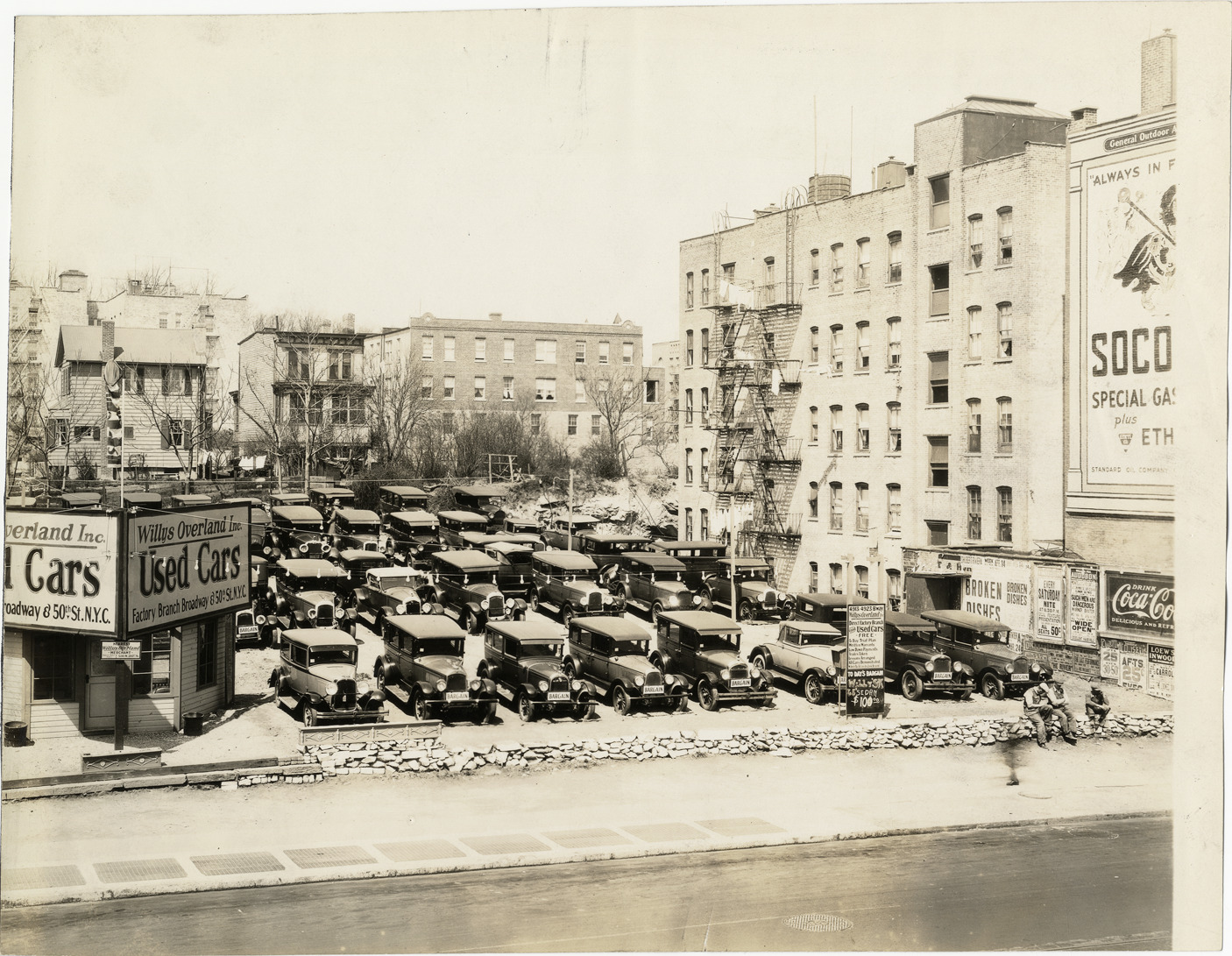 View of cars parked in Willys-Overland used car lot at New York, New York. Sales office in foreground; buildings in background. Stamped on back: "N. Lazarnick, photographic illustrations, 230 Park Avenue, New York Central Building, New York, N.Y. Tel. Vanderbilt 0011-12-13-14-15." Handwritten on back: "Used cars, c.1930."