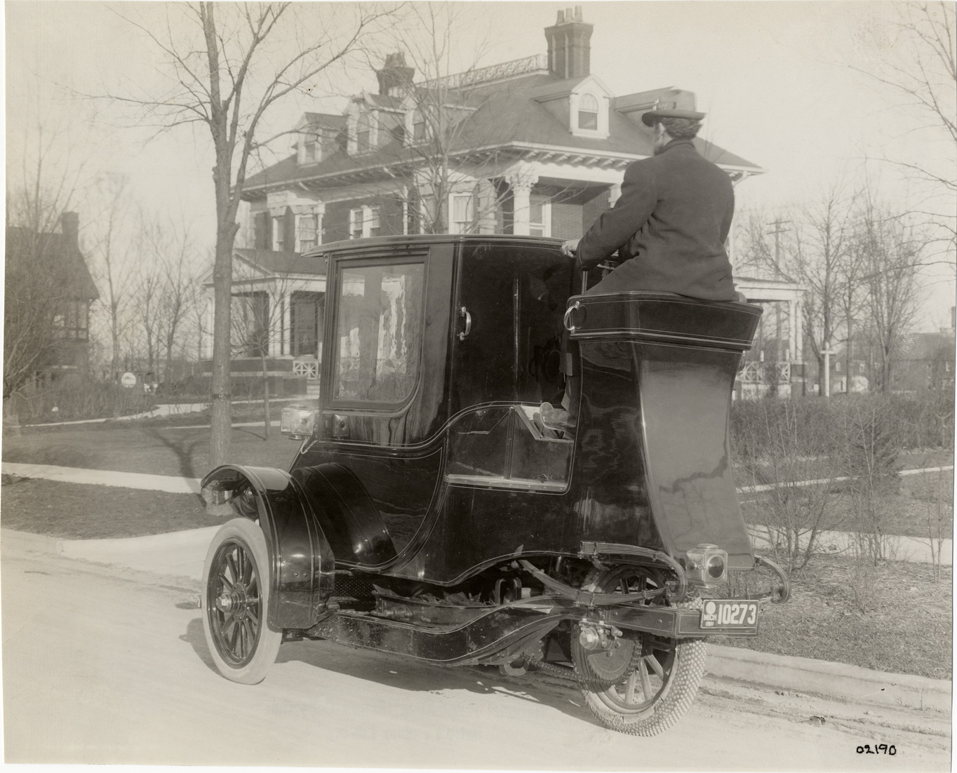 Rear view of man driving a Wagenhals vehicle. House in background. Stamped on back: "Spooner & Wells, Inc., photographers, 1231 Woodward Ave., Detroit, Mich., telephone North 1745." Handwritten on back: "Wagenhalls [sic]. Wagenhals, 1911."