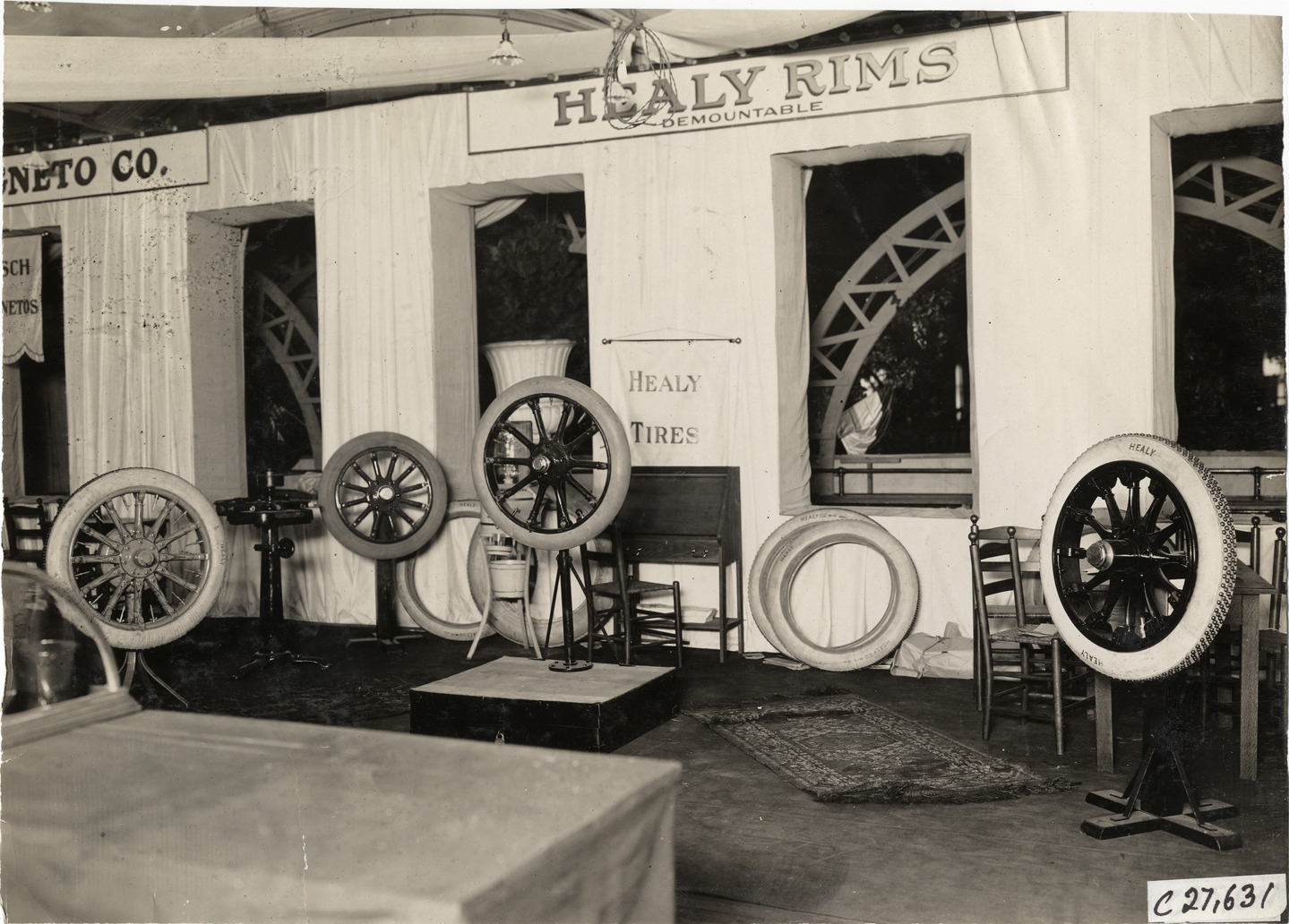 View of display of Healy tires and demountable rims at trade show. Stamped on back: "Spooner & Wells, Inc., photographers, telephones 3472-3473 Columbus, 1931 Broadway, New York." Handwritten on back: "Wheels, Healy rims, 1909."