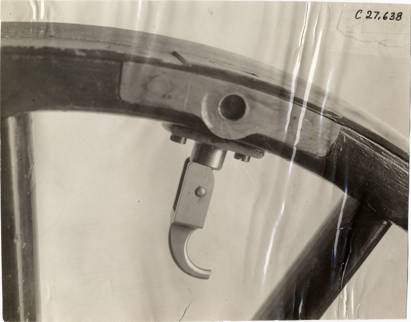 Close-up view of car wheel with Dow rim. Handwritten on back: "Wheels, Dow rim, 1909."