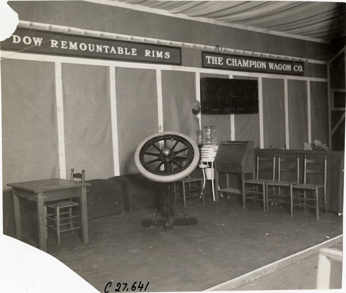 View of display of Dow remountable rim and tire at trade show. Chairs, desk and watercooler in display. "Dow remountable rims" and "The Champion Wagon Co." signs in background. Stamped on back: "Spooner & Wells, Inc., photographers, telephones 3472-3473 Columbus, 1931 Broadway, New York." Handwritten on back: "Wheels, Dow rim, 1909."