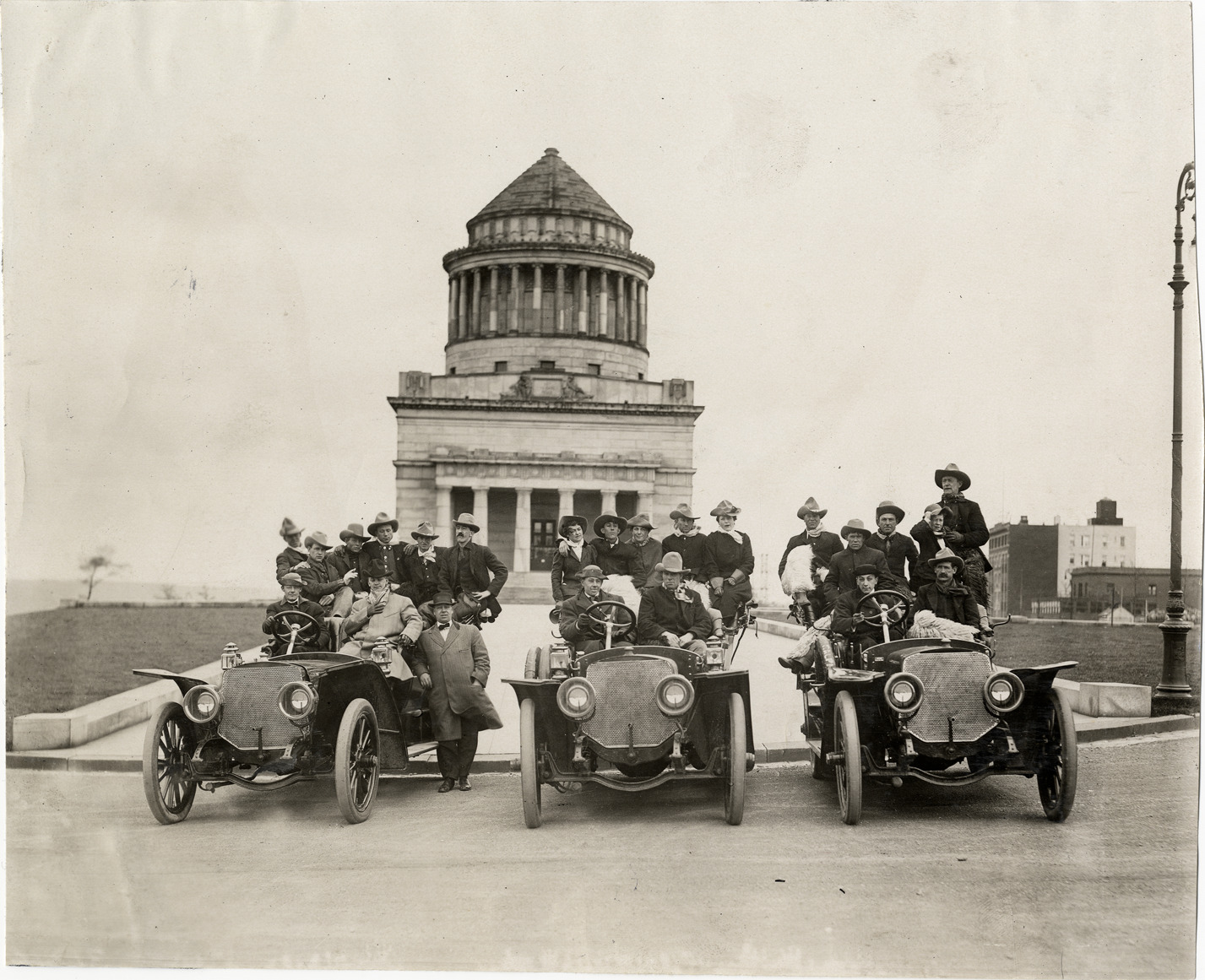 Cast members from Buffalo Bill's Wild West Show posing with automobiles in front of Grant's Tomb