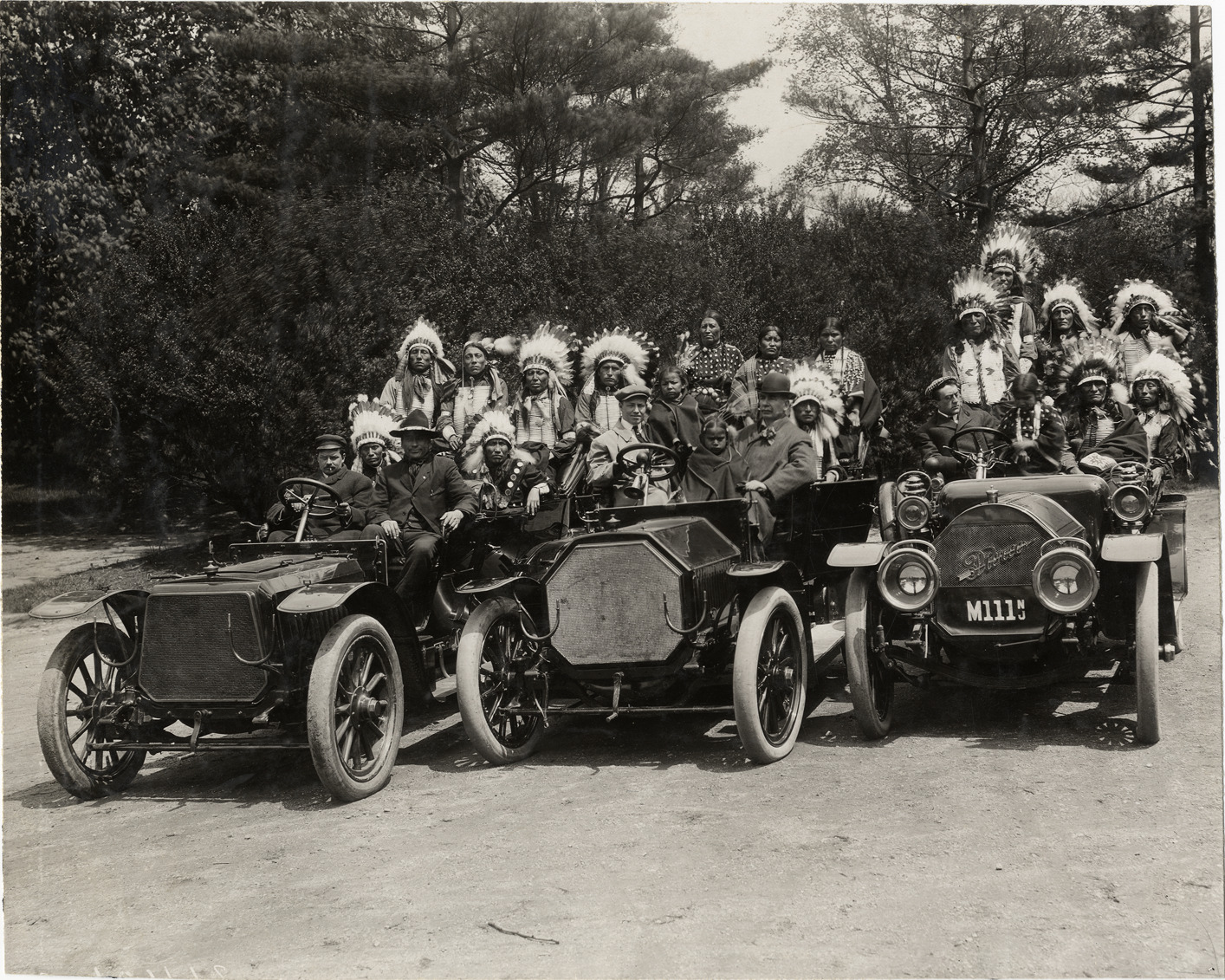 View of American Indian men, women and children posing with drivers in three cars for Buffalo Bill's Wild West Show. Pierce-Arrow car on right. Stamped on back: "Spooner and Wells, 1931 Broadway, New York, duplicates any time, enlargements all sizes, tel. 3472-3473 Col., credit appreciated." Handwritten on back: "Wild West Shows--Buffalo Bill's Wild West Show."