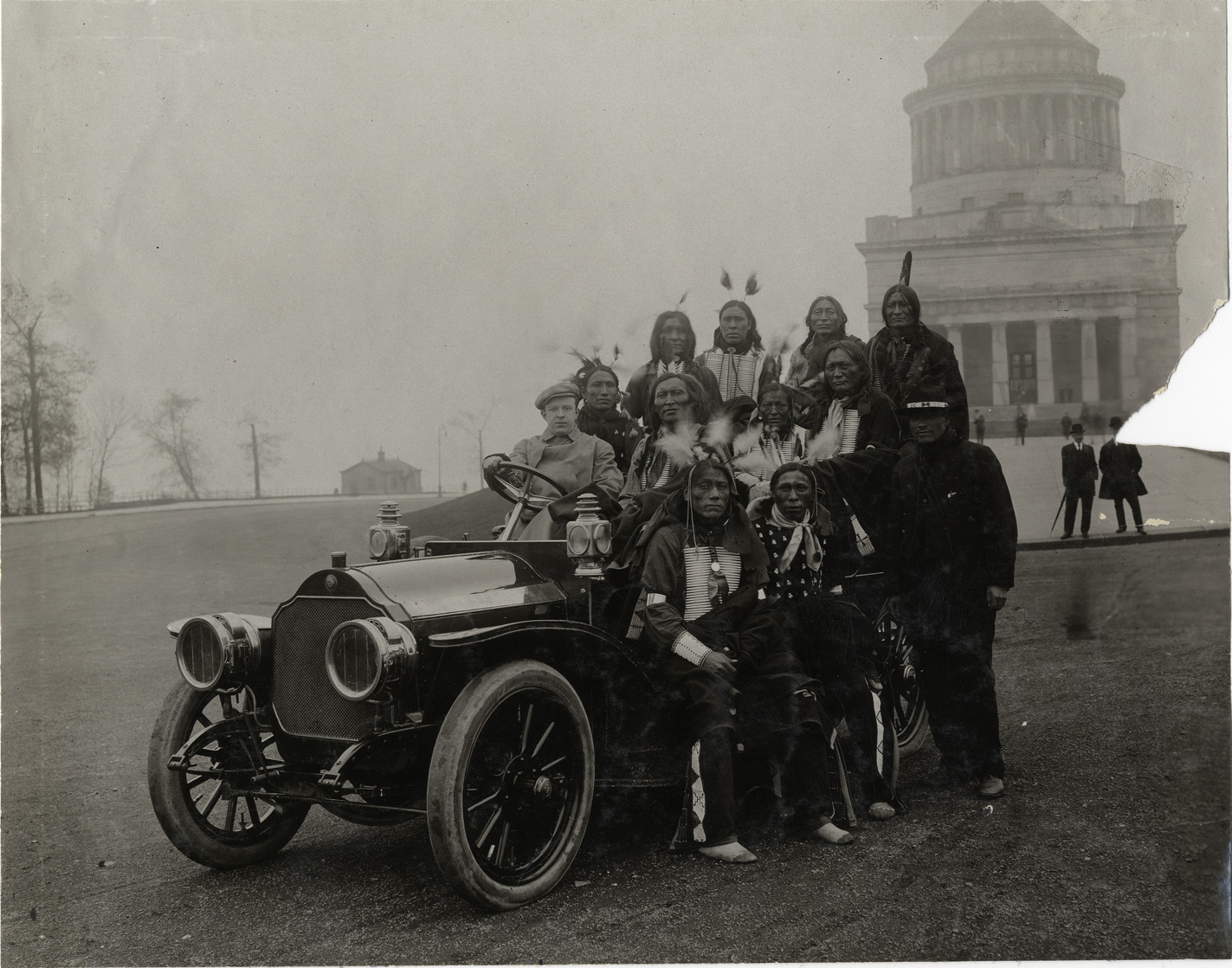 View of Native American men from Buffalo Bill's Wild West Show posing in car in front of Grant's Tomb, New York. Handwritten on back: "Wild West Shows--Buffalo Bill's Wild West Show, 1908."