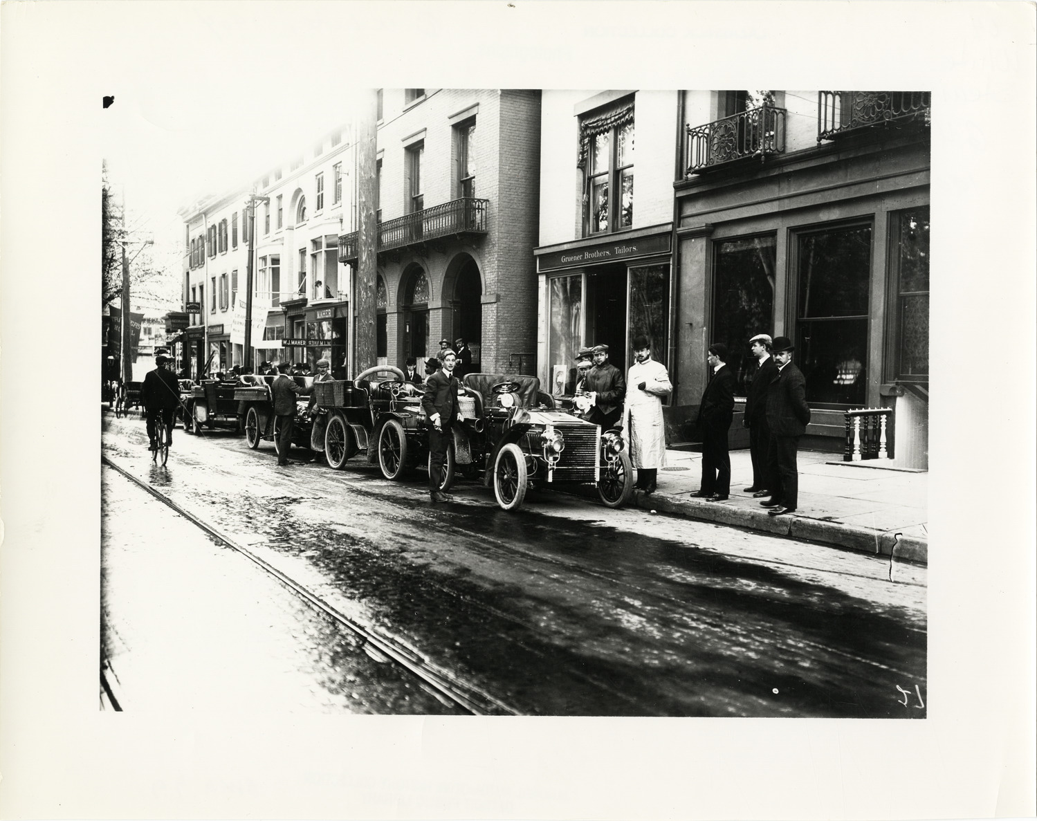 View of motorists posing with 1904 White Steamer car during the 1905 Pittsburgh Endurance Run. Cars are parked along curb; Gruener Bros. tailors shop and other businesses in background. Handwritten on back: "Pittsburgh Endurance Run, 1905. White, 1904."