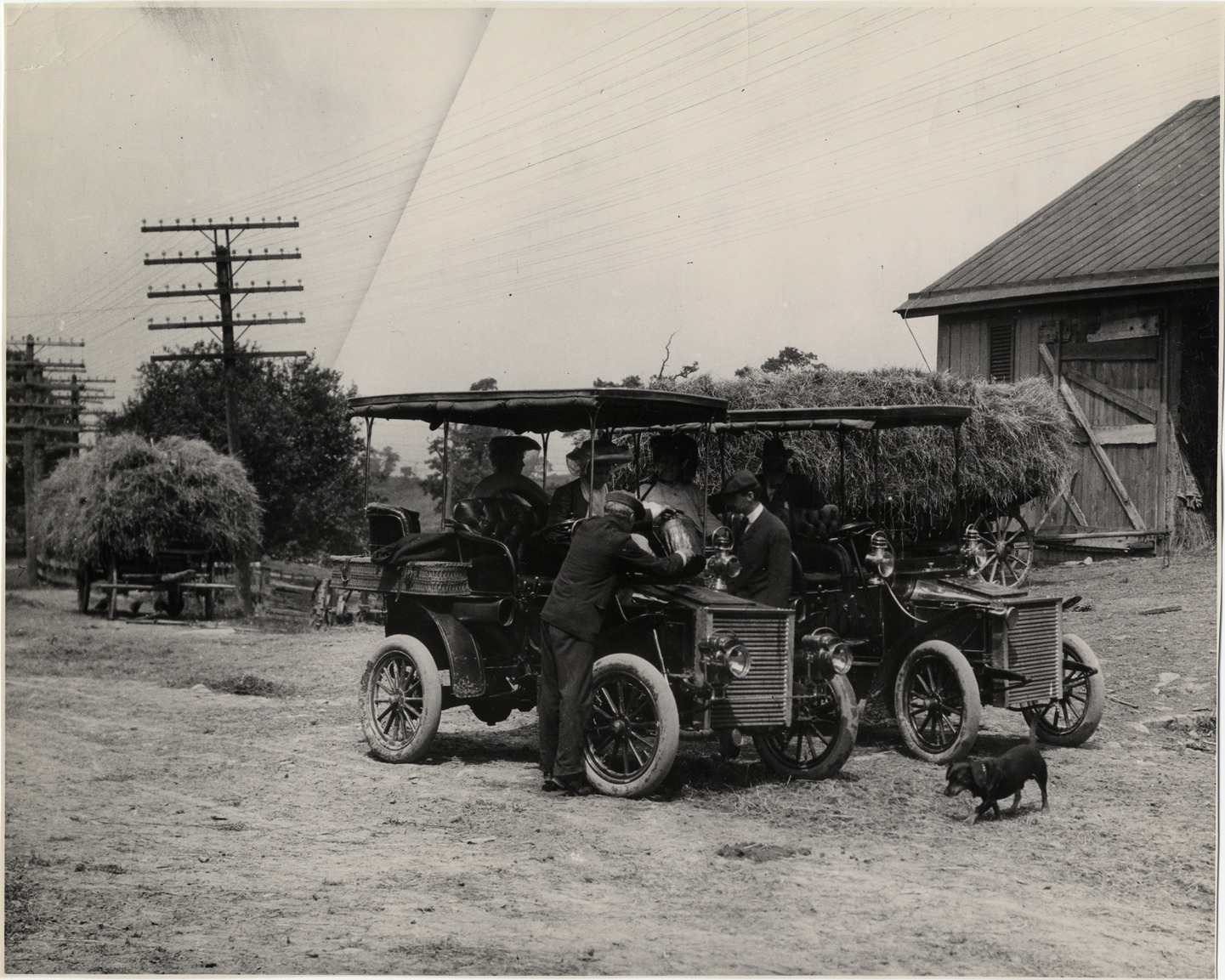 View of motorists adding water to two 1904 White Steamer cars. Dog in foreground; barn and hay wagons in background. Stamped on back: "Photo by Albert Mecham, Highwood, Ill." Handwritten on back: "White steamers taking on water. White, 1904."