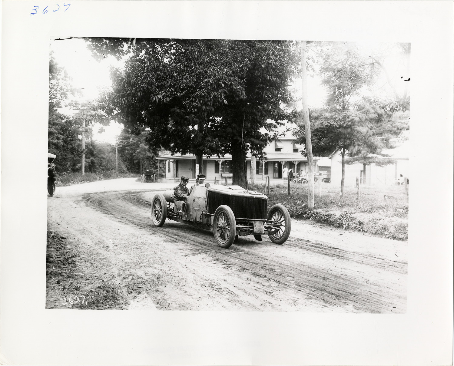 View of motorists in 1905 White Steamer racecar traveling on rural dirt road. Wooden-frame commercial building in background. Handwritten on back: "White Steam. White, 1905."