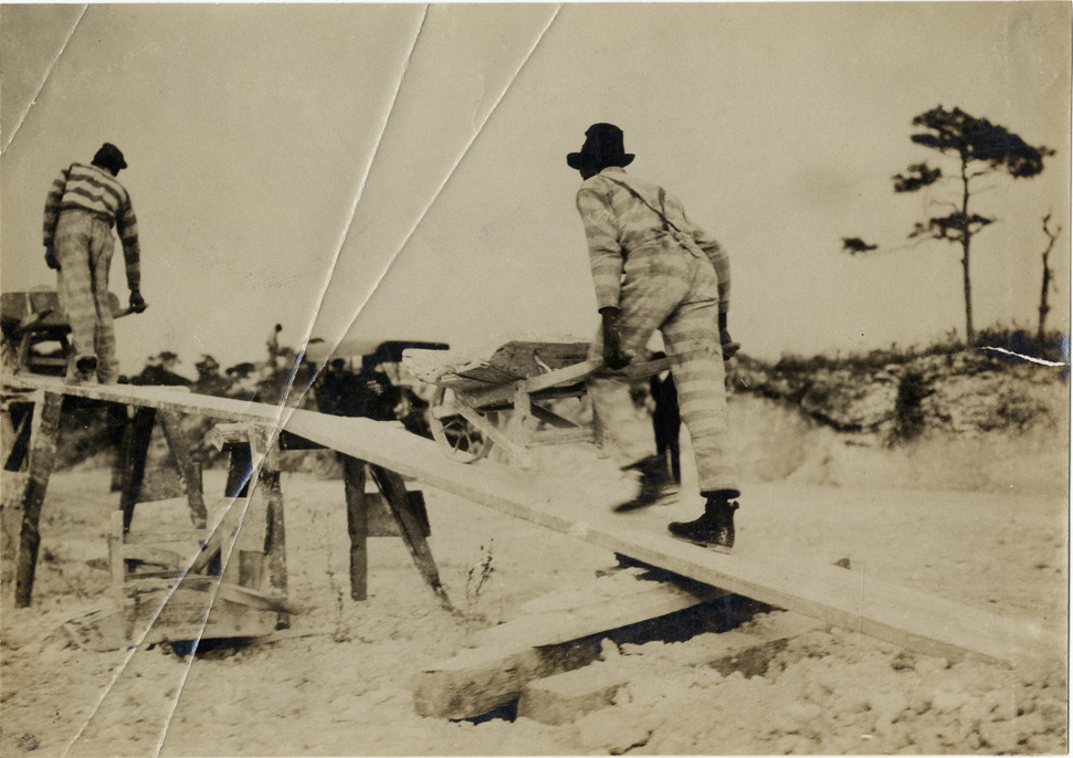 Convicts pushing wheelbarrow up ramp during road construction, Florida
