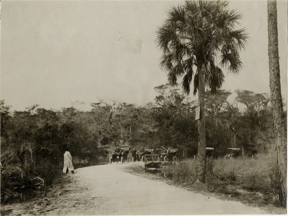 View of motorists in 1905 Model "E" White Steamer cars traveling on rural dirt road in Florida. Palm tree in foreground. Stamped on back: "Photo by N. Lazarnick, 29 West 42nd Street, New York." Handwritten on back: "This was one of six cars that toured in Florida after the Ormond-Daytona races and just before leaving for the Cuba Race. The date was Feb. 2, 1906. White Steamer, 1905. Model E."
