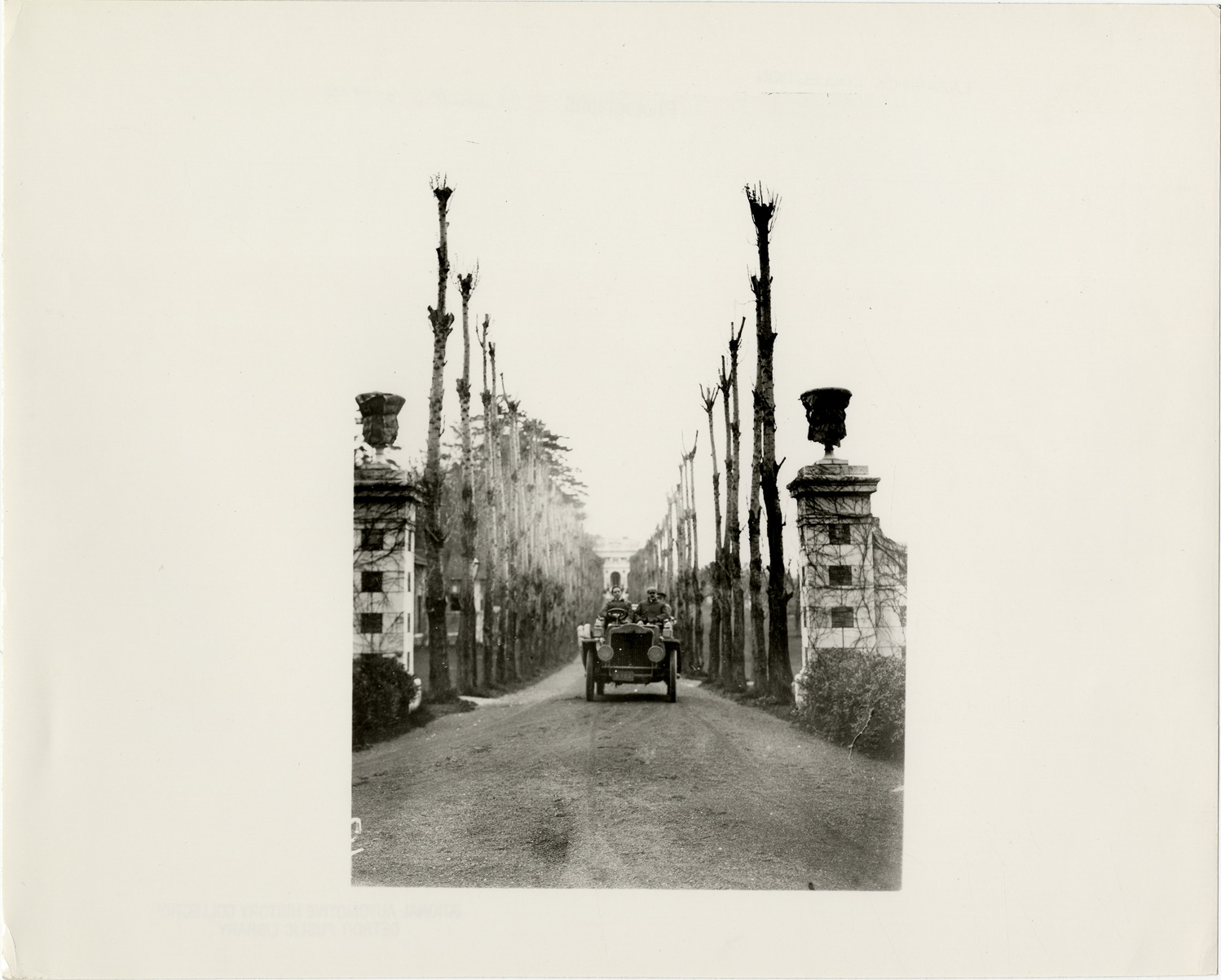 Favorite this☆ Motorists in White Steamer passing through gateposts Description: View of motorists in White Steamer car passing through gateposts. Bare trees lined driveway. Handwritten on back: "White, c.1905." Details Resource ID: na031500 Subject: Automobiles, Steam White Company (Cleveland, Ohio) Gates Photographic prints Date Issued: 1905 (year approximate) Format: 1 photographic print ; 8 x 10 in. Member of: National Automotive History Collection Lazarnick Collection Filing Location: White, 1905 #1 Rights: Physical rights are retained by DPL. Copyright is retained in accordance with U.S. copyright laws.