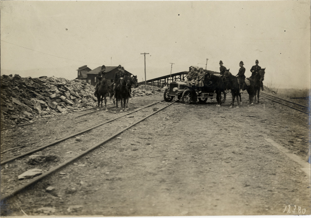 Motorists in 1905 White Steamer automobile with group of mounted police at coal mine, Scranton, Pennsylvania