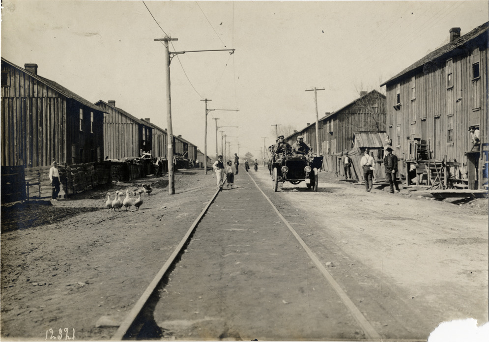 View of motorists in 1905 White Steamer car traveling through coal mining district. Road is lined with board and batten houses; children stand in road; flock of ducks on left. Handwritten on back: "White Steamer, 1905."