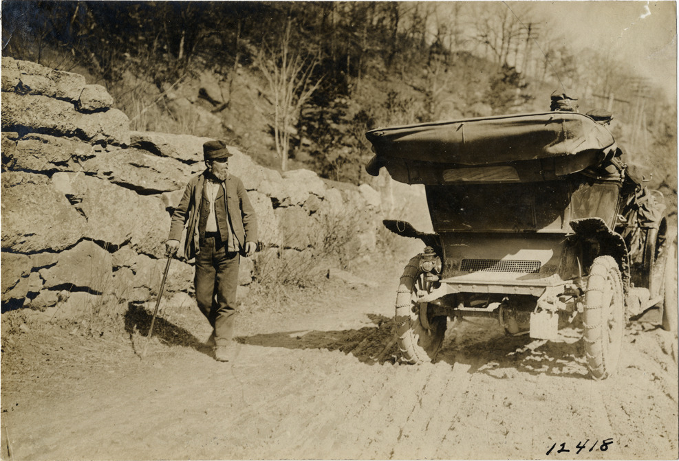 Rear view of motorists in 1905 White Steamer car passing a man walking in road. Man holds a walking stick. Stamped on back: "Photo by N. Lazarnick, 29 West 42nd Street, New York." Handwritten on back: "White Steamer, 1905."