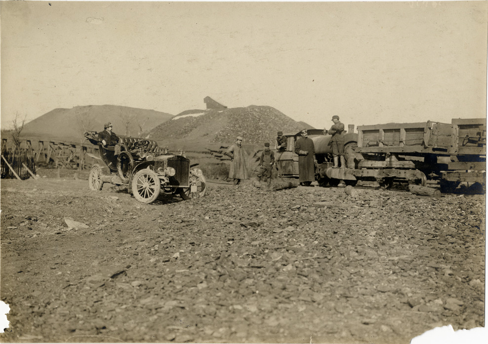 Motorists with 1905 White Steamer automobile at coal mining operation, Scranton, Pennsylvania