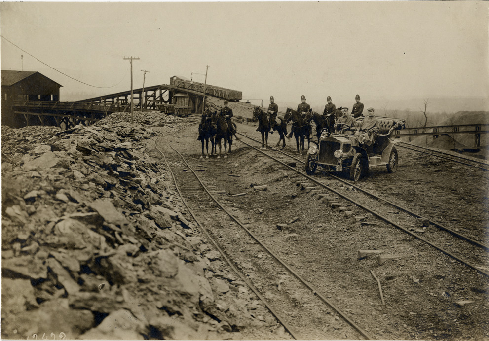 Motorists in 1905 White Steamer automobile with group of mounted police at coal mine, Scranton, Pennsylvania