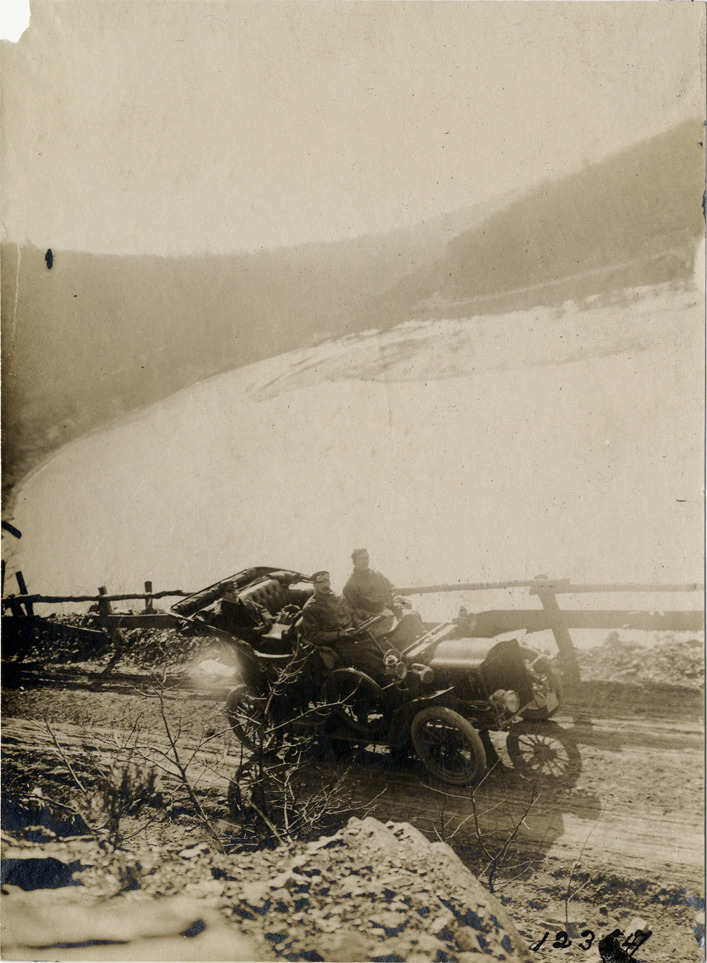 View of motorists posing in 1905 White Steamer car on dirt road adjacent to river. Stamped on back: "Photo by N. Lazarnick, 29 West 42nd Street, New York." Handwritten on back: "A fine scenery. White Steamer, 1905."