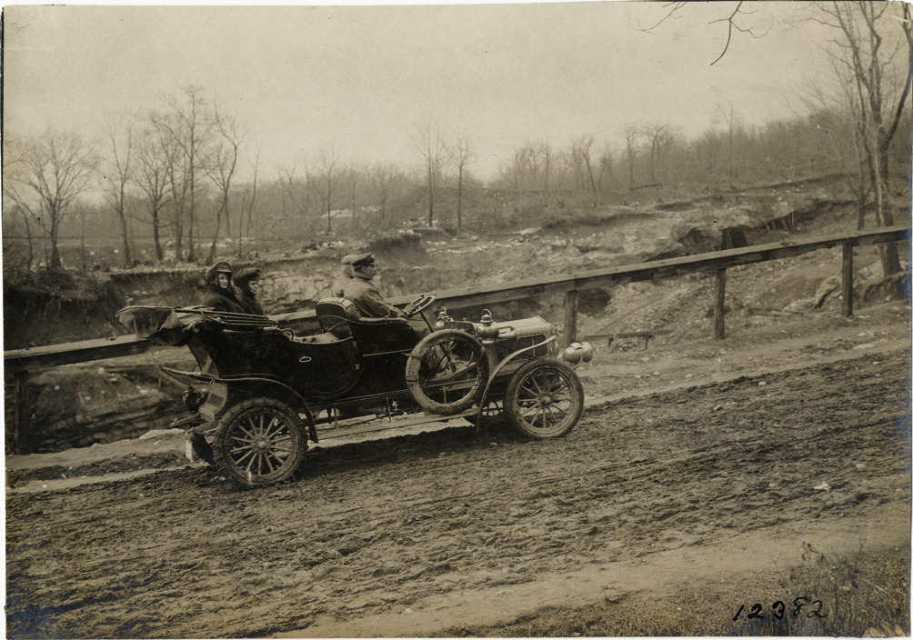 Motorists in 1905 White Steamer automobile traveling on rural road