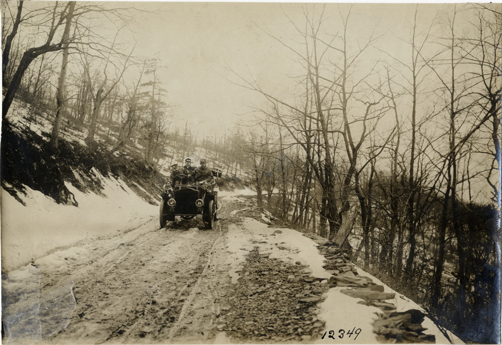Favorite this☆ Motorists in 1905 White Steamer automobile traveling on snow-covered mountain road Description: View of motorists in 1905 White Steamer car traveling on snow-covered mountain road. Handwritten on back: "White Steamer, 1905." Details Resource ID: na031603 Subject: Automobiles, Steam White Company (Cleveland, Ohio) Mountain roads Photographic prints Date Issued: Unknown year Format: 1 photographic print ; 4.75 x 6.75 in. Member of: National Automotive History Collection Lazarnick Collection Filing Location: White, 1905 #3 Rights: Physical rights are retained by DPL. Copyright is retained in accordance with U.S. copyright laws.