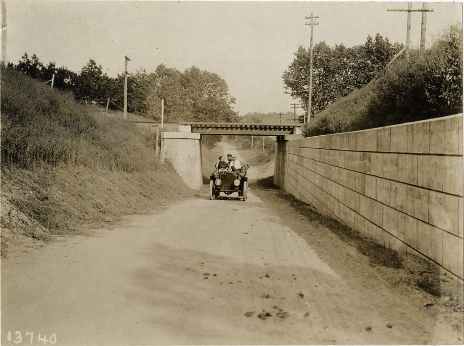 Motorists in 1906 White Steamer automobile passing under railroad bridge near Roslyn, New York