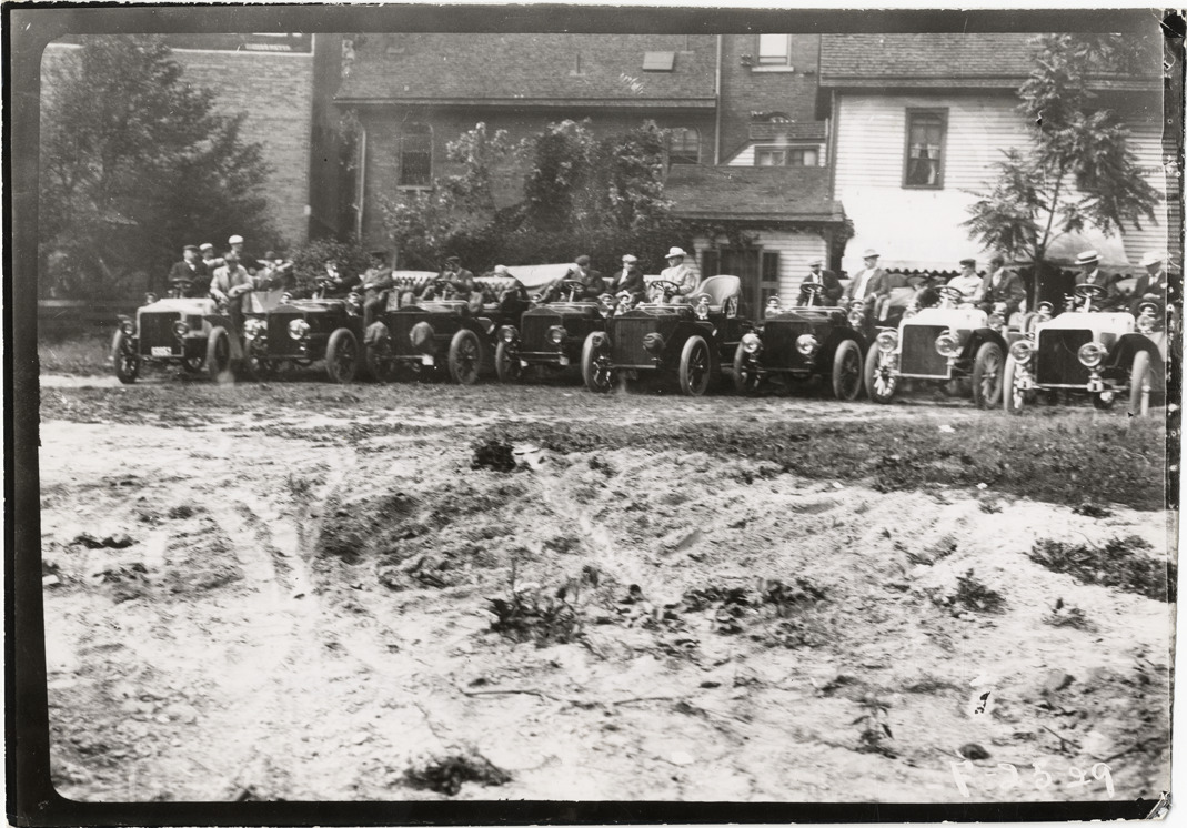 Motorists in White Steamer automobiles lined up in field or vacant lot
