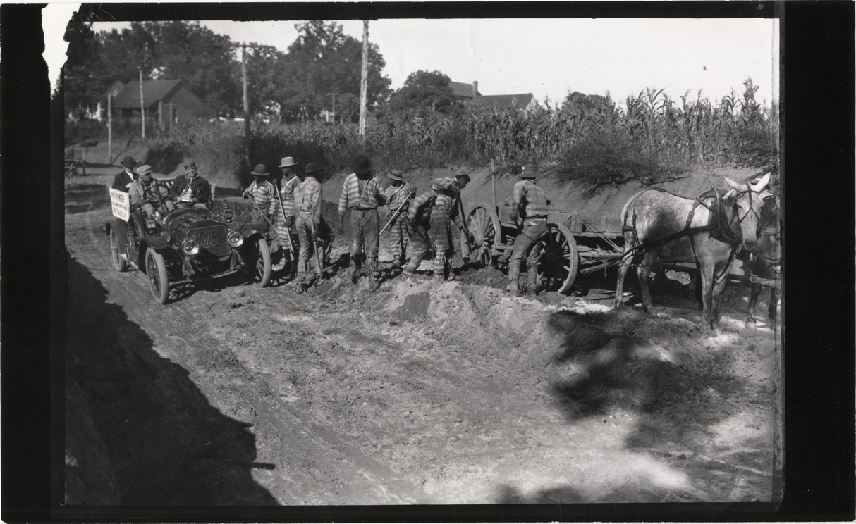 Motorists in White Steamer automobile passing convicts doing road construction