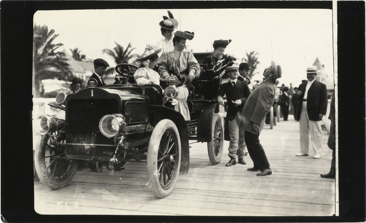 Women and children in 1906 White Steamer automobile smiling at man standing on boardwalk