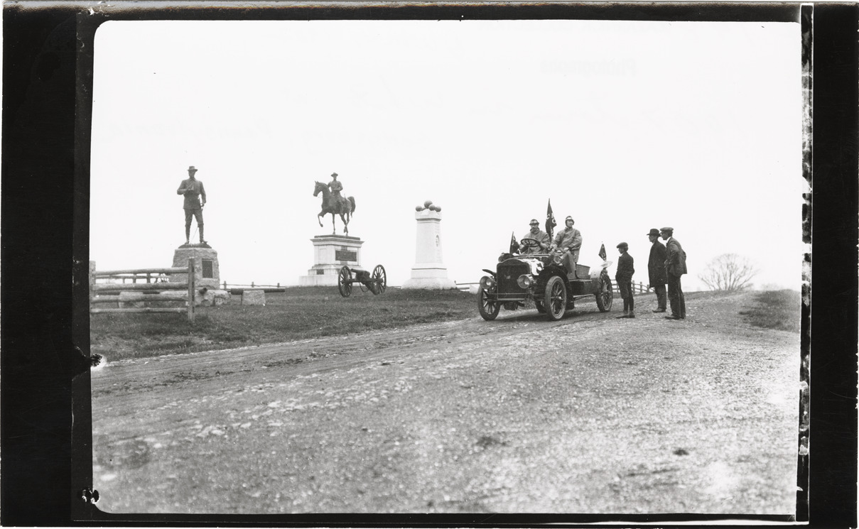 View of motorists in a 1907 White Steamer car at Gettysburg, Pennsylvania during an unidentified 1907 tour. Statues and cannon on left; onlookers stand on right. Handwritten on back: "White, 1907. 1907 tour in White at Gettysburg, Pennsylvania."