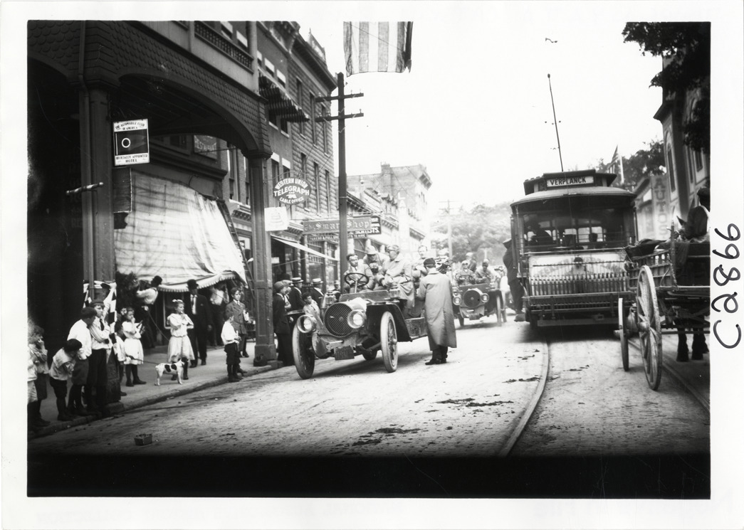 View of driver and passengers in Franklin car parked in front of commercial buildings during the 1909 Catskill-Berkshire Tour sponsored by the New York Automobile Trade Association. Spectators stand on sidewalk; streetcar on right. The tour covered a route through New York, New Jersey, Massachusetts and Connecticut. Handwritten on back: "Tours--N.Y.A.T.A. Catskill-Berkshire Tour, 1909."