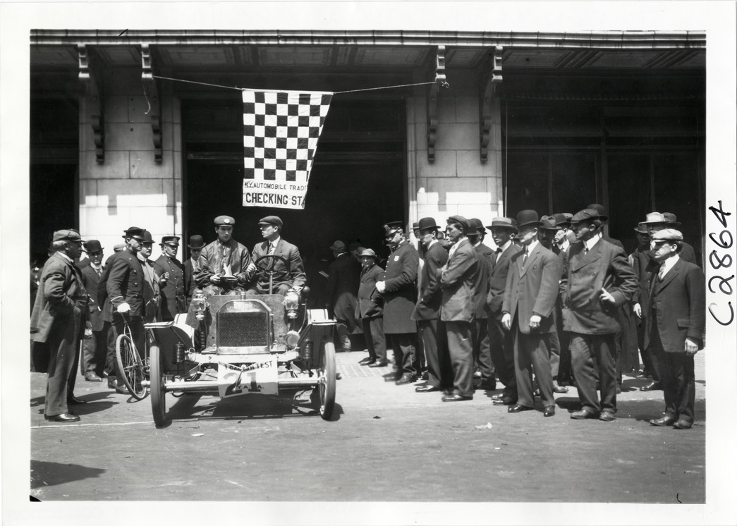 Motorists in Brush automobile at checking station, 1909 Catskill-Berkshire Tour