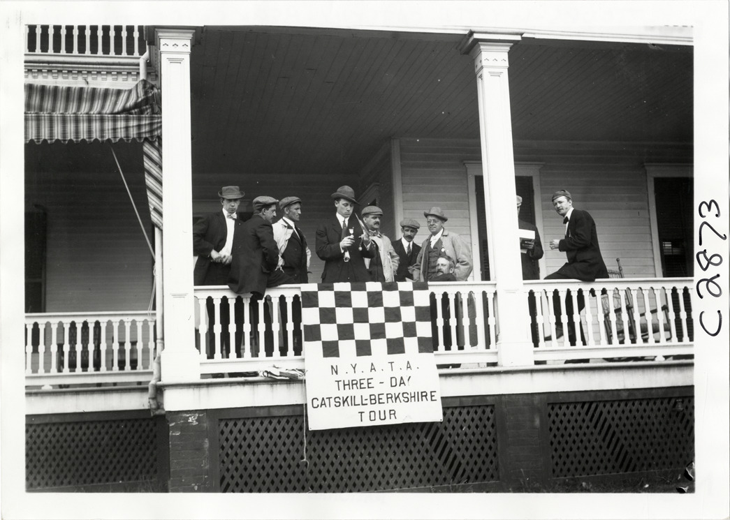 View of men on porch of Grants House hotel in Catskill, New York during the 1909 Catskill-Berkshire Tour sponsored by the New York Automobile Trade Association. Banner draped over railing reads: "N.Y.A.T.A. Three-Day Catskill-Berkshire Tour." The tour covered a route through New York, New Jersey, Massachusetts and Connecticut. Handwritten on back: "Tours--N.Y.A.T.A. Catskill-Berkshire Tour, 1909."