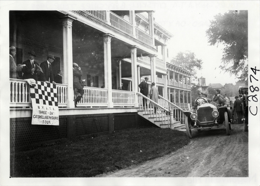 View of motorists in Stoddard-Dayton car parked in front of Grants House hotel in Catskill, New York during the 1909 Catskill-Berkshire Tour sponsored by the New York Automobile Trade Association. Banner draped over railing reads: "N.Y.A.T.A. Three-Day Catskill-Berkshire Tour." The tour covered a route through New York, New Jersey, Massachusetts and Connecticut. Handwritten on back: "Tours--N.Y.A.T.A. Catskill-Berkshire Tour, 1909."