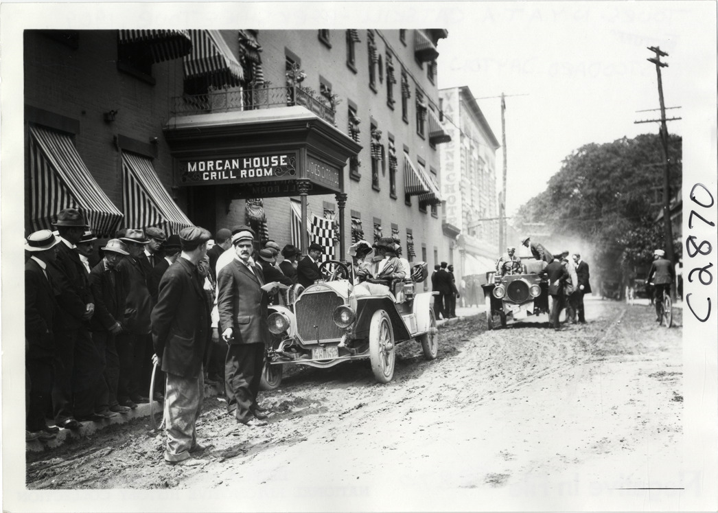 View of motorists in Stoddard-Dayton car in front of the Morgan House hotel in Poughkeepsie, New York during the 1909 Catskill-Berkshire Tour sponsored by the New York Automobile Trade Association. Onlookers stand on sidewalk; "Morgan House Grill Room, ladies entrance" sign over hotel entrance. Franklin car in background. The tour covered a route through New York, New Jersey, Massachusetts and Connecticut. Handwritten on back: "Stoddard Dayton. Tours--N.Y.A.T.A. Catskill-Berkshire Tour, 1909."