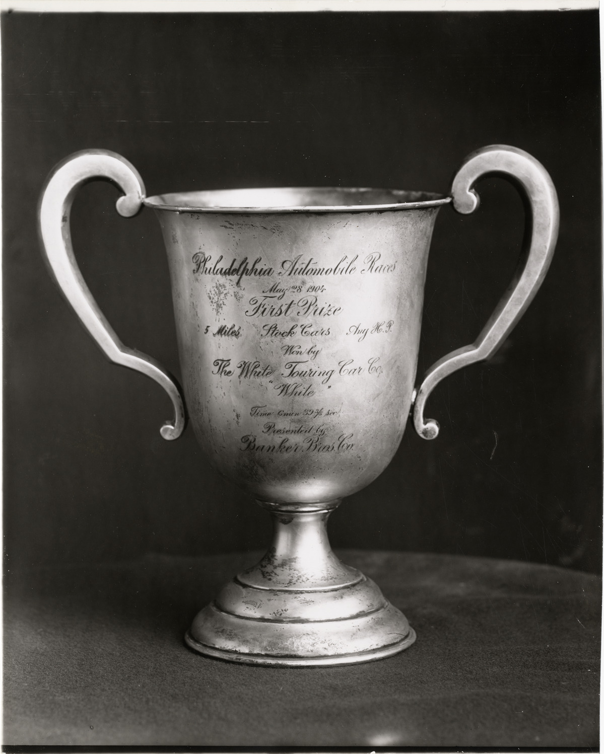 View of the Philadelphia automobile races trophy cup which was awarded to Webb Jay, driving the White Steamer called "Whistling Billy." Inscribed on cup: "Philadelphia automobile races, May 28, 1904, first prize, 5 miles, stock cars, any h.p. Won by the White Touring Car Co., 'White.' Time 6 min. 39 3/5 sec., presented by Banker Bros. Co." Stamped on back: "Photographic illustration by Nick Lazarnick, 230 Park Ave., N.Y." Handwritten on back: "White steamer Whistling Billy and some trophies it won. Trophies."