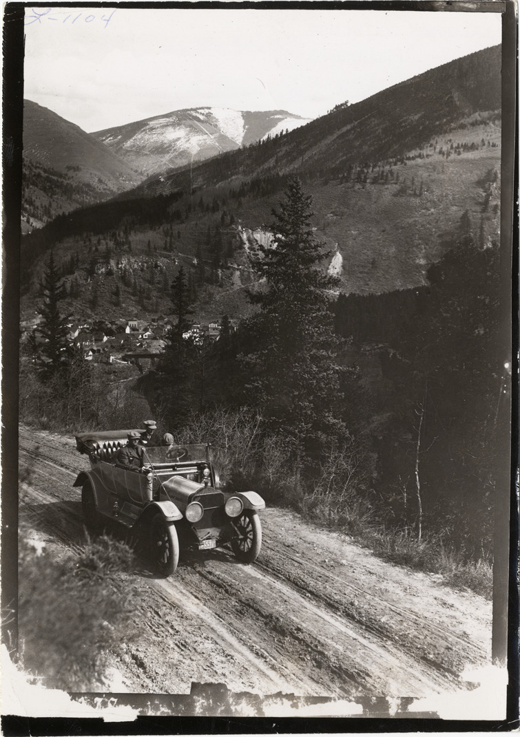 View of motorists in 1913 White car on mountain road in Leadville, Colorado during a 1912 pathfinding tour from Denver, Colorado to Salt Lake City, Utah. Stamped on back: "Photographic illustration by Nick Lazarnick, 230 Park Ave., N.Y." Handwritten on back: "Leadville, Col. White, 1913."